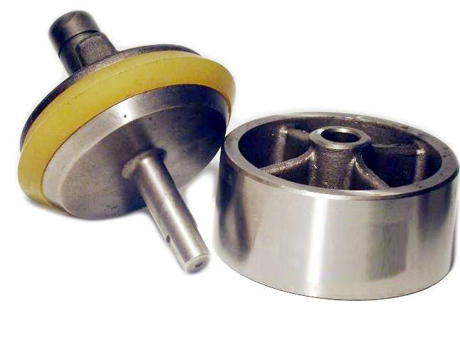 Pistón armado completo, con copas de goma, cuerpo metálico, placas de sujeción y anillos resorte (Seguros).